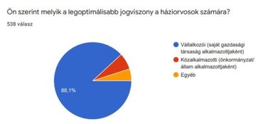 A legoptimálisabb jogviszonynak továbbra is vállalkozói státuszt tartják, a válaszadók 88 százaléka ezt a választ jelölte meg – ez valamivel kevesebb, mint a jelen állapot szerinti foglalkoztatási viszony (93,1 százalék – lásd fentebb) – , a közalkalmazotti jogviszonyt kevesen választanák.