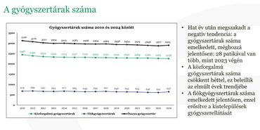 A fiókgyógyszertárak száma 2024 végén 647 volt, azaz jelentősen, 35 darabbal nőtt 2023 decemberéhez képest, ami 5%-os növekedést jelent. Ez összeségében azt jelenti, hogy nagyjából 45-50 ezer lakos számára vált lehetővé a gyógyszerellátás helyben ott, ahol ez korábban nem volt elérhető.