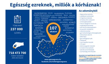 A 2009-ben indult Richter Egészségváros eddig összesen 107 településen járt, és több mint 718 millió forint adományt gyűjtött össze a hazai egészségügyi intézmények számára. Az idei programokon befolyt összegből a Sátoraljaújhelyi Erzsébet Kórház a gasztroenterológiai szakellátás diagnosztikus eszközparkjának fejlesztését, a Győr-Moson-Sopron Vármegyei Petz Aladár Egyetemi Oktató Kórház a betegvárók komfortosabbá tételét, a Gyöngyösi Bugát Pál Kórház pedig új sebészeti műtéti eszközök beszerzését tűzte ki célul.