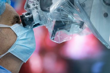 Dr. Csókay András idegsebész mikroszkóp alatt szétválasztja a közös agyi idegpályákat, 2019. augusztus 1-jén