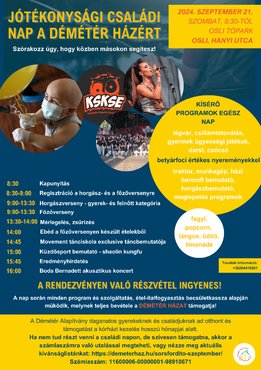 Szeptember 21-én, szombaton egész napos jótékonysági eseményt rendeznek a Démétér Ház javára az Oslitópark Szabadidő és Rendezvény Központban - küldött meghívót a Démétér Alapítvány.